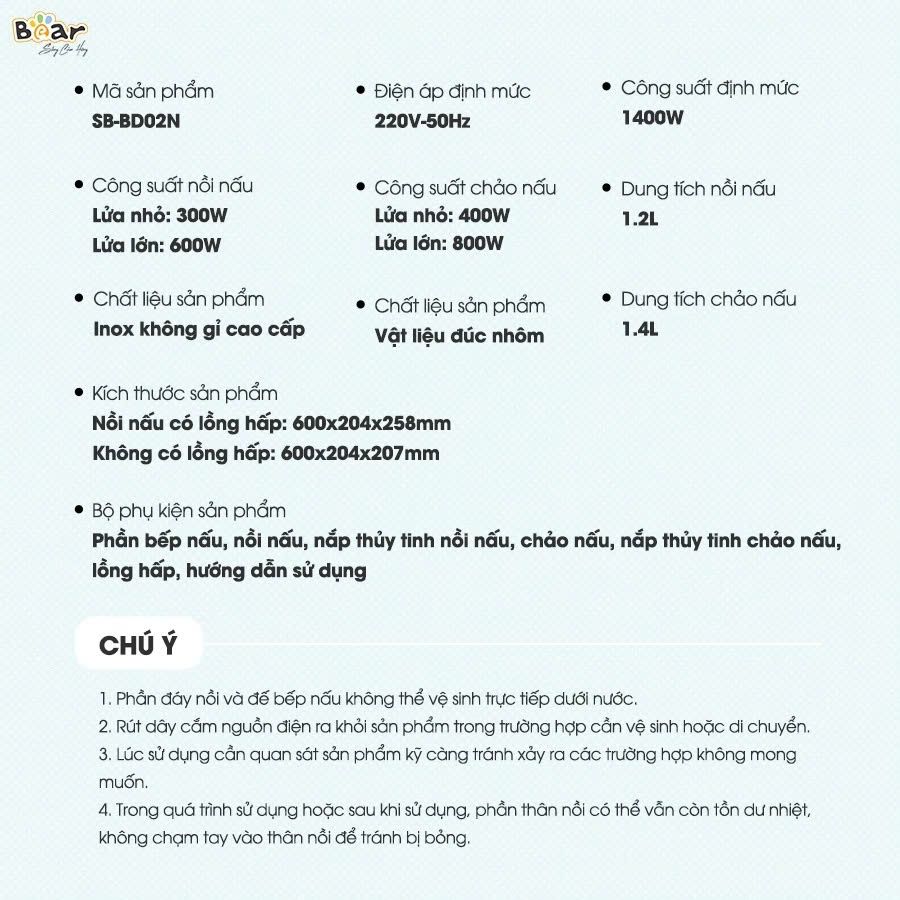 - Dung tích: Nồi nấu 1.2L - Chảo nấu 1.4L.