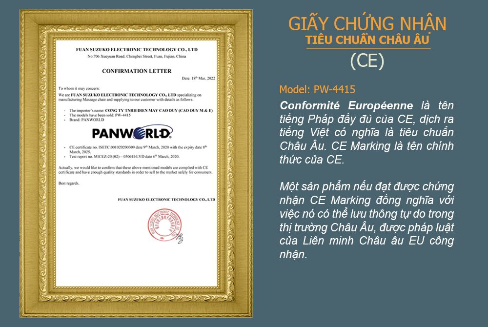Ghế massage Panworld PW-4415 tự hào đạt được chứng nhận tiêu chuẩn Châu Âu (tiêu chuẩn CE). Một sản phẩm đạt được chứng nhận CE Marking đồng nghĩa với việc nó có thể lưu thông tự do trong thị trường Châu Âu, được pháp luật của Liên minh Châu âu EU công nhận. Do đó, từ chất liệu, công năng đến chất lượng sản phẩm đều có thể đáp ứng được một trong những thị trường khó nhất thế giới.