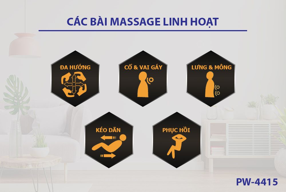 Thực hiện các chương trình massage thông minh, phù hợp với thể trạng với từng người trong việc điều trị vật lý, chăm sóc sức khỏe của các thành viên trong gia đình. Ngoài ra, ghế massage PW-4415 còn có các chức năng tiện ích khác như: Ghế có trang bị đèn Led, đèn sẽ chỉ hoạt động khi ghế được đặt cách tường 2cm; chức năng hẹn giờ và khóa trẻ em.