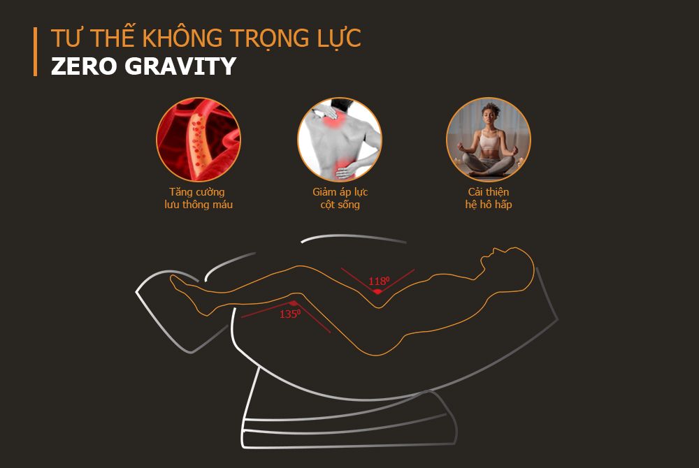 Chương trình massage không trọng lực sẽ đưa người nằm vào vị trí mà góc giữa phần đùi và phần bắp chân là 135 độ. Tư thế không trọng lực mô phỏng theo tư thế của các phi hành gia vũ trụ NASA. PW-4415 còn cải tiến góc nằm siêu rộng với phần chân có thể mở rộng 12cm Ở tư thế này sẽ hạn chế tối đa trọng lực tác động vào cơ thể, giúp máu lưu thông từ các bộ phận về tim tốt hơn từ đó giúp bạn sảng khoái, tỉnh táo và thư giãn một cách tối đa.