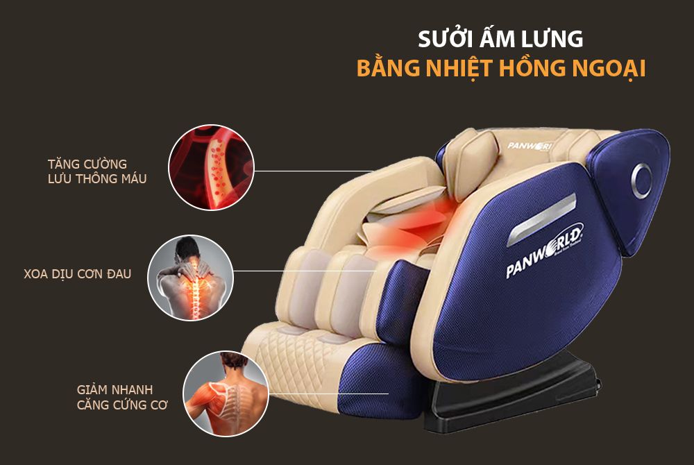 Được thiết kế ở phần lưng giúp cung cấp một lượng nhiệt đến các huyệt đạo trên cơ thể từ đó tăng hiệu quả massage lên gấp nhiều lần, giúp giảm đau lưng, đốt sống, đĩa đệm; thúc đẩy trao đổi chất, cải thiện giấc ngủ, đặc biệt là nới lỏng và thư giãn cơ bắp, lưu thông tuần hoàn máu tốt hơn.