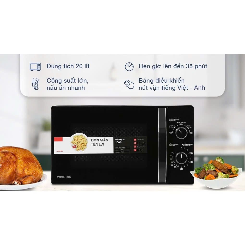- Lò vi sóng Toshiba kích cỡ nhỏ gọn, thiết kế đơn giản, hiện đại, dung tích 20 lít bỏ vừa gà nguyên con khoảng 1 kg