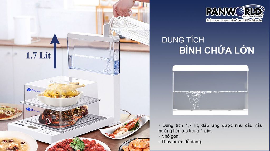 Chi tiết chứa nước của máy có dung tích 1.7 lít, đáp ứng được nhu cầu nấu nướng liên tục trong 1 giờ. Vì vậy, bạn không cần phải túc trực để châm nước thường xuyên khi chế biến một món ăn, bạn có thể tiết kiệm được khá nhiều thời gian và công sức để chế biến các món khác, công việc bếp núc sẽ trở nên nhẹ nhàng hơn bao giờ hết.