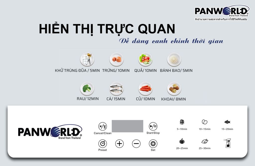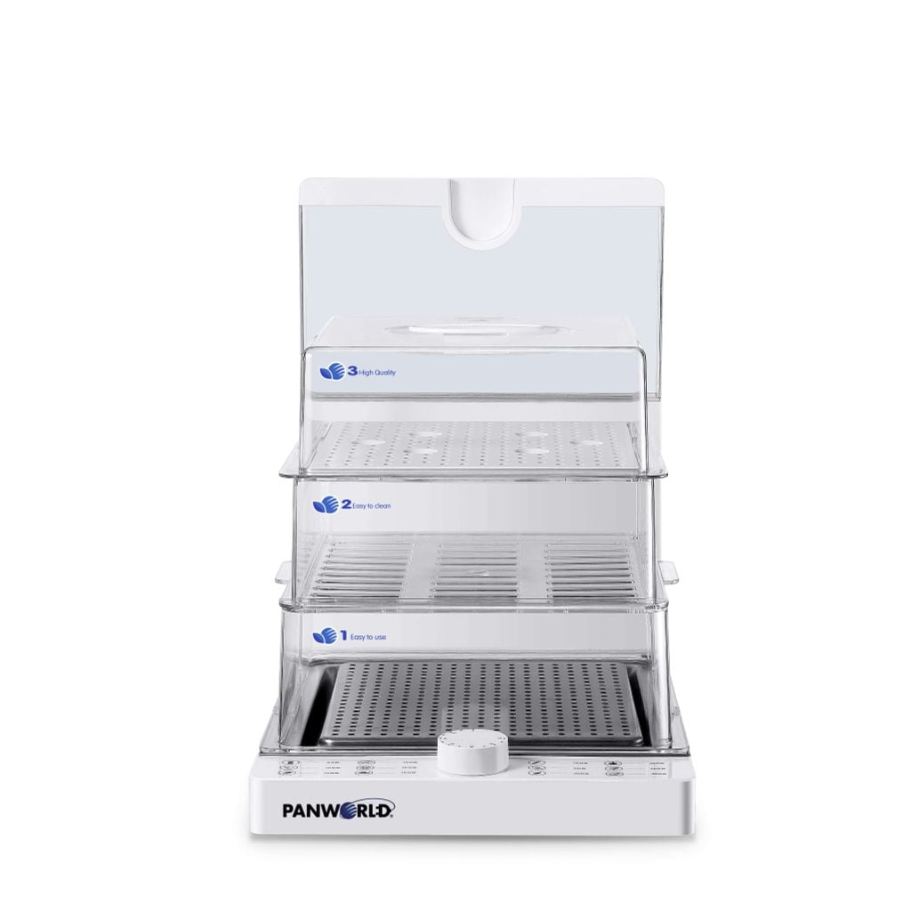 Máy hấp điện PANWORLD PW-2322 có phần khoang hấp và phần nắp được làm từ vật liệu PP có độ trong suốt cao, dễ dàng quan sát được thực phẩm bên trong.