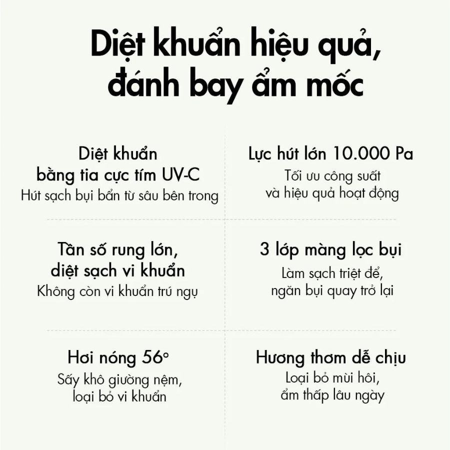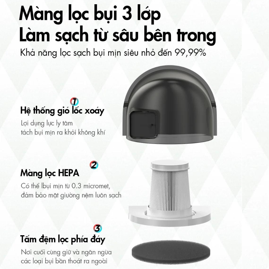 - Màng lọc Hepa: có thể hút bụi mịn từ 0,3 micromet, đảm bảo giường nệm luôn sạch