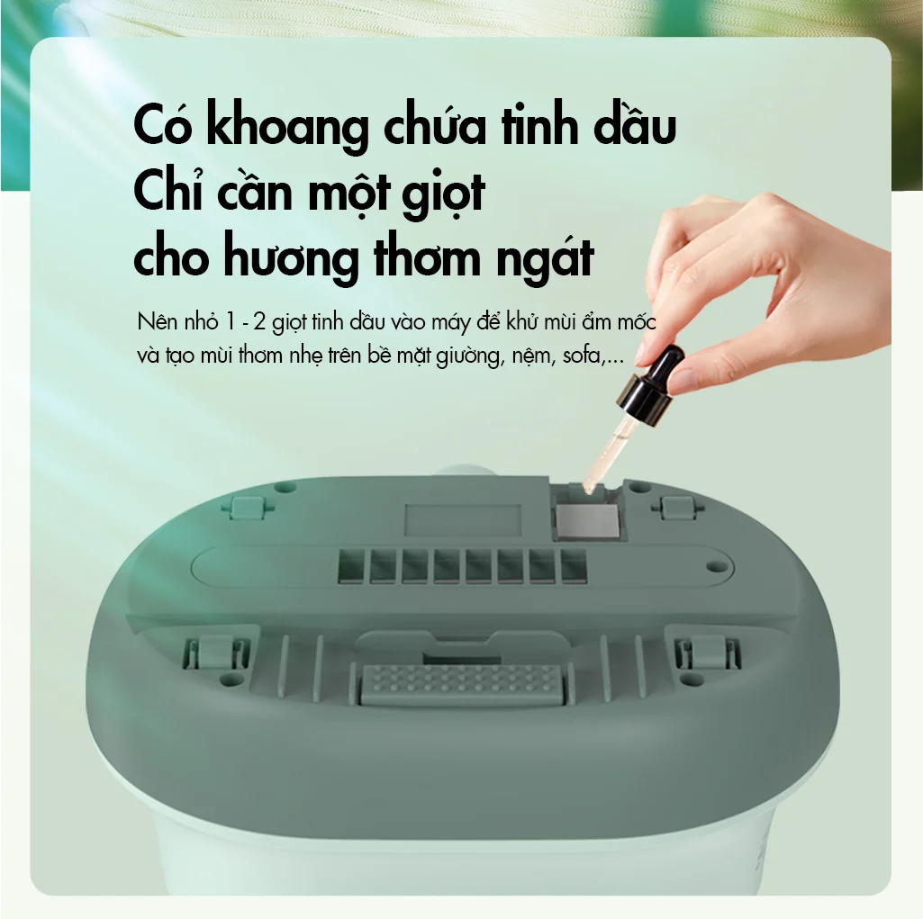 Bạn có thể thêm loại tinh dầu với mùi hương yêu thích của bạn vào khoang chứa tinh dầu trên thân máy để cải thiện mùi hôi, ẩm thấp lâu ngày trên bề mặt sofa, thảm lông, chăn, gối,...