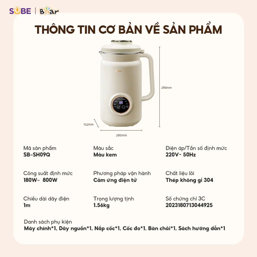 Máy Làm Sữa Hạt BEAR Đa Năng 1L Công Nghệ Chống Ồn Xay Nhuyễn Mịn Công Suất 800W Xay Nấu 3 Chiều SB-SH09Q