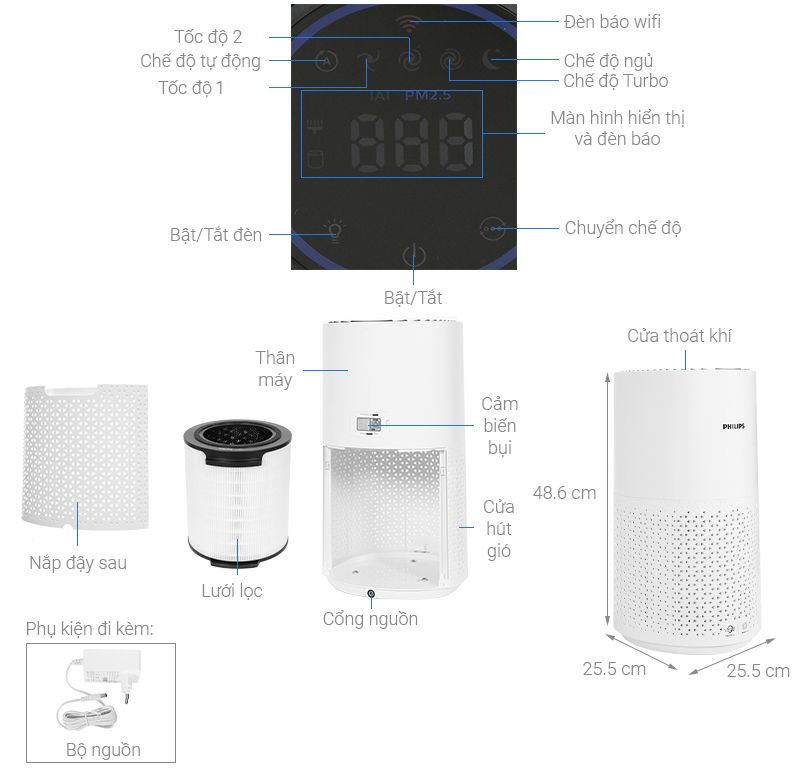 Điều khiển bằng điện thoại qua ứng dụng riêngĐèn báo chất lượng không khíCảnh báo thay bộ lọcĐèn báo hoạt động