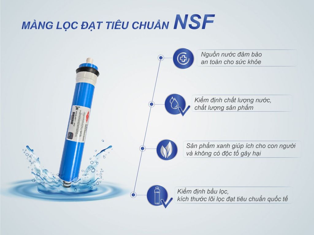 Sử dụng màng lọc đạt tiêu chuẩn NSF (viết tắt của National Sanitation Foundation) là trung tâm hợp tác về an toàn thực phẩm và nước uống của tổ chức y tế thế giới (WHO)