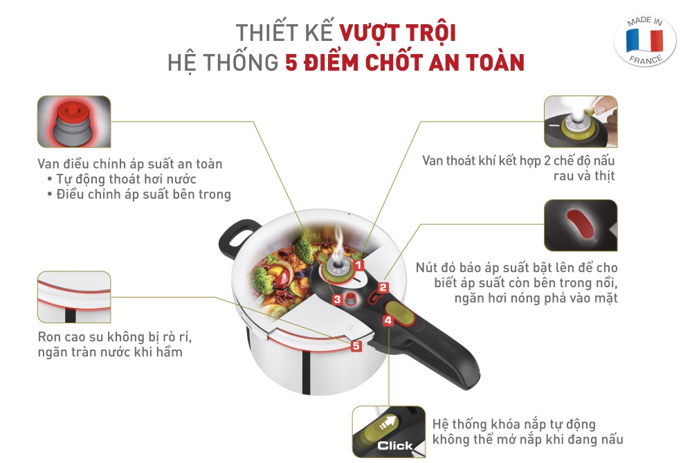 - Van nồi áp suất Tefal nấu đa năng thoát khí an toàn kết hợp 2 chế độ nấu rau (112 ° C) và thịt (117 ° C).