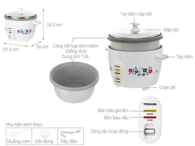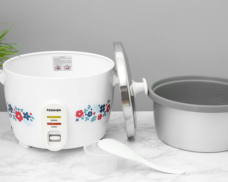 Nồi cơm điện nắp rời Toshiba có màu chủ đạo là màu trắng trang nhã, được điểm tô thêm các hoa văn đẹp mắt, đem lại sự nhẹ nhàng cho không gian bếp của bạn. Nồi còn được thiết kế với nút gạt điều khiển 2 chế độ nấu và giữ ấm, có đèn báo quan sát, rất phù hợp với những gia đình có nhu cầu nấu cơm cơ bản, không yêu cầu quá nhiều tính năng.