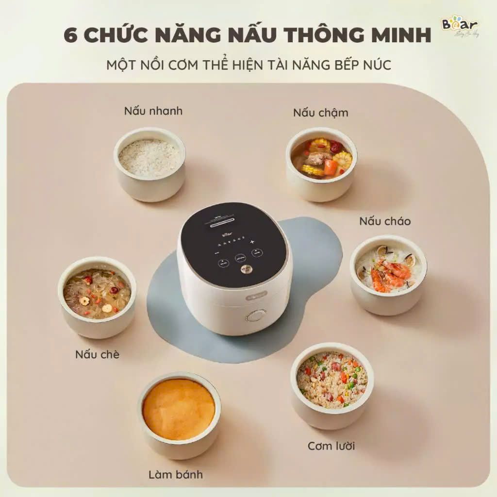 ✔️Chức năng đa dạng: Nấu Nhanh - Nấu Cơm - Nấu Cháo - Súp - Đồ Ngọt - Làm Bánh - Giữ Nhiệt là những tính năng được tích hợp trên chiếc nồi cơm điện Bear. Mỗi chế độ đều có những ưu điểm, công dụng và cách thực hiện riêng nhằm đem đến cho người dùng sự tiện lợi khi sử dụng sản phẩm.