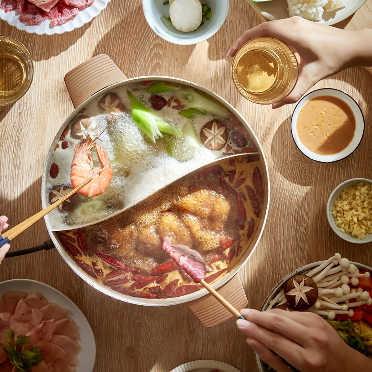 Thiết kế ngăn đôi cho phép nấu cùng lúc 2 vị lẩu hoặc vừa nướng vừa nấu lẩu.