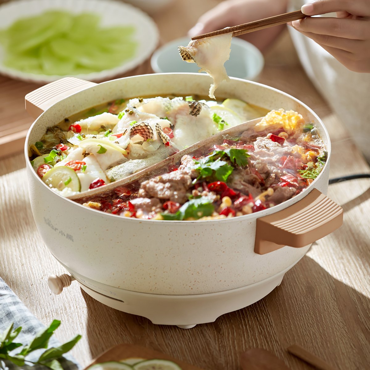 Nồi lẩu điện Bear hoạt động với công suất 1360W, nấu chín thức ăn nhanh chóng, tiết kiệm thời gian, giảm hao phí điện năng tối đa