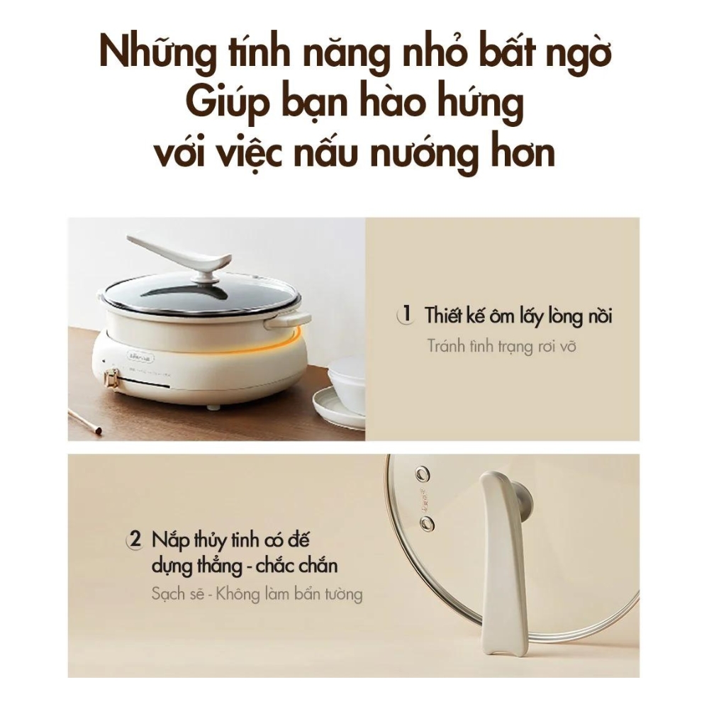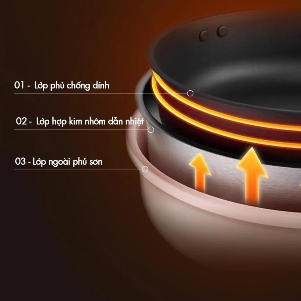 Thiết kế tinh tế tỉ mỉ với ba lớp kết hợp. Dẫn nhiệt nhanh và duy trì ổn định. (1) Lớp ngoài phủ sơn, (2) Lớp giữa là hợp kim nhôm dẫn nhiệt, (3) Lớp phủ chống dính.