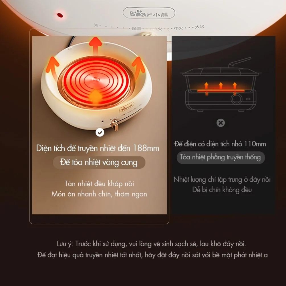 Đáy nhiệt hình vòng cung đường kính 188mm có khả năng tỏa nhiệt đều. Tránh cháy, khét khi nấu lẩu.